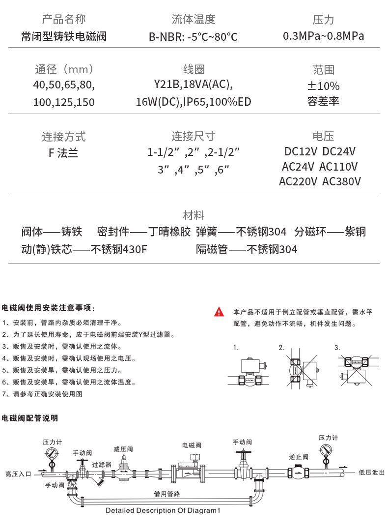 材 料 | 閥體——鑄鐵 密封件——NBR 隔磁管——不銹鋼304 動(dòng)鐵芯——不銹鋼430F 靜鐵芯——不銹鋼430F 彈簧——不銹鋼304 分磁環(huán)——紫銅 |
